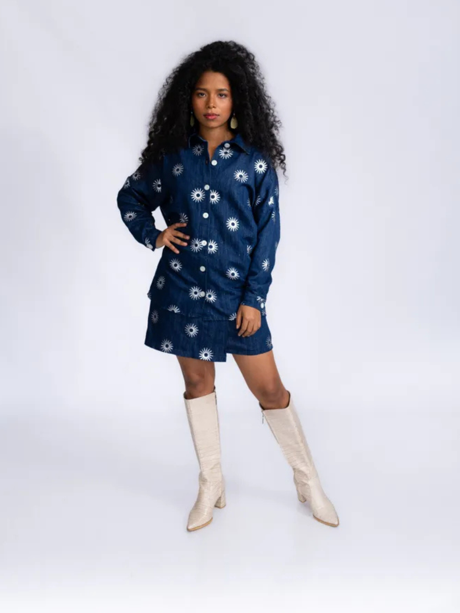 La Inti Skirt está confeccionada en denim de cáñamo con una composición de 66% algodón y 44% cáñamo, ofreciendo una prenda resistente, cómoda y con un enfoque sostenible. Su diseño incluye pinzas en la parte posterior para lograr un calce perfecto, y apliques plateados en forma de sol que destacan sobre el denim. Para conservar su calidad, no se debe lavar en agua caliente ni utilizar secadora; se recomienda secarla siempre a la sombra. Puedes combinarla con nuestra Inti Shirt para llevarte el Set Inti completo.