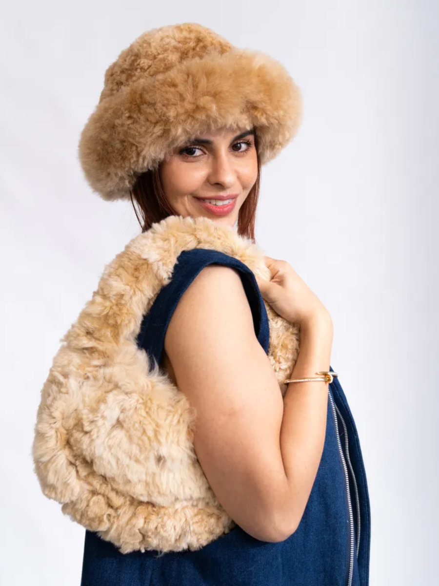 La Puyu Bag destaca por su textura suave y lujosa, elaborada en 100% baby alpaca fur ética, en una elegante combinación de colores: Cherry, Baby Pink y Natural. Cuenta con un forro interno de algodón que asegura practicidad sin comprometer la comodidad ni el diseño. Para su mantenimiento, se recomienda limpieza en seco (dry clean). Puedes combinarla con una Musuq Hat del mismo color y llevarte el combo ideal de accesorios en baby alpaca.