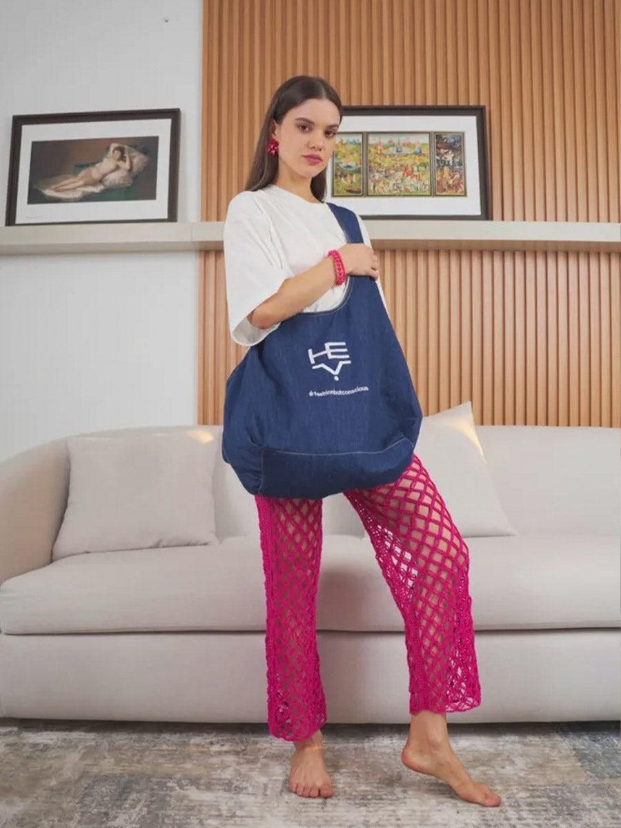 El Maxi Bolso HEY. está confeccionado en denim de cáñamo con una composición de 66% algodón y 44% cáñamo, y forro interior de 100% algodón, lo que garantiza durabilidad, resistencia y un enfoque sostenible. Para preservar su calidad y estructura, no se recomienda lavarlo en agua caliente ni usar secadora. Debe secarse siempre a la sombra y, preferiblemente, limpiarse en seco (dry clean) para una mejor conservación.