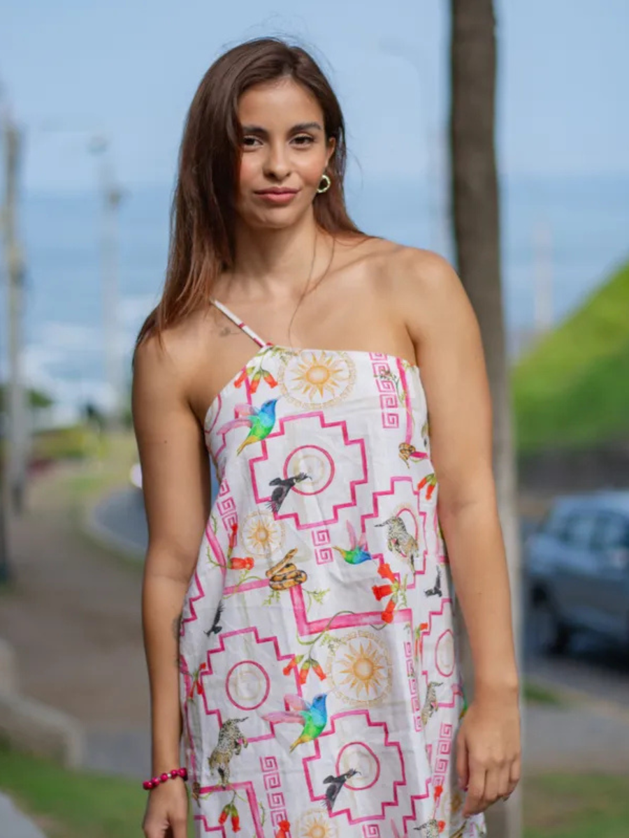 El Mini Dress P.A.C.H.A está confeccionado en una mezcla ligera y fresca de 80% lino y 20% algodón, ideal para climas cálidos. Su estampado digital aporta originalidad y carácter, convirtiéndolo en una prenda versátil perfecta para cualquier ocasión. Para conservar su forma y colores, se recomienda no lavar en agua caliente ni usar secadora, y secarlo siempre a la sombra.
